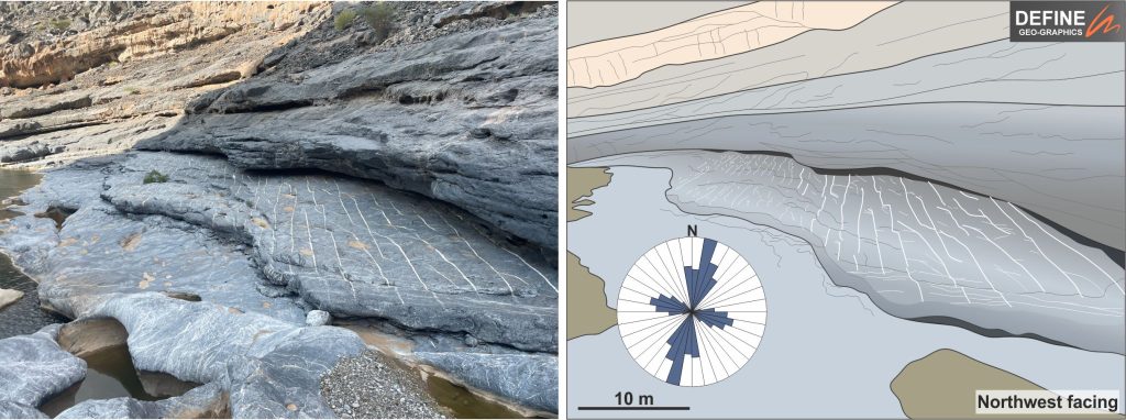 The below image was taken at Wadi Damm in Oman in December 2023 during a camping trip turned geological field trip. As you can imagine, the others on the trip were not impressed by the pitstop to examine and measure the bedding dips and fracture orientations!